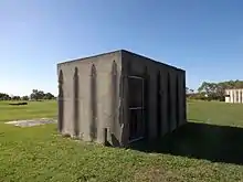 The control hut is made of concrete 12 inches (300 mm) thick and is approximately 19 by 22 feet (5.8 by 6.7 m). It stands close to the park edge at Boggy Creek, aligned southwest-northeast. The rectangular plan is divided into even quarters with three enclosed rooms and an open entry courtyard in the southwest quarter. There are two doorways off the open courtyard, protected by a freestanding blast wall. The door to the northwest opens into a fully enclosed room (former workshop and store) which connects to a room to the northeast (former indicator loop room). The storeroom contains an uninstalled louvered timber door, leant up against the wall. The indicator loop room has a single narrow unglazed observation window at eye height on the northeast corner. This narrow opening is sheltered by an external cantilevered tapered concrete hood.[1]