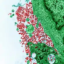 | Colorized transmission electron micrograph showing the rabies virus (in red) infecting cultured cells | |