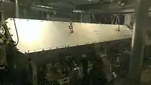A radio-frequency quadrupole (RFQ) is a linear accelerator component[1] generally used at low beam energies, roughly 2keV[2] to 3MeV. It is similar in layout to a quadrupole mass analyser but its purpose is to accelerate a single-species beam (a beam of one particular type of particle) rather than perform mass spectrometry on a multiple-species beam. As charged particles are accelerated along the beam line they alternately experience electric fields in two axes at right angles to the direction of motion, offset in phase, such that there is always a forwards force in the beam direction (Z), plus a beam focussing action alternately in X and then in Y. This is achieved by exciting 4 electrodes that run the length of the accelerator, and are shaped to have a periodically varying gap that matches the RF frequency to the beam velocity at that point in the accelerator. This causes the particles to form bunches in step with the exciting frequency, such that they pass through each region as the local field is near the acceleration maxima. There are two common electrode shapes, either a group of 4 vanes with a wave pattern on the tips that approach, or 4 cylinders with periodic conical sections. The electrodes are mounted in vacuum and excited from by suitably phased signals from a high power RF source.[3] The advantages over a conventional RF LINAC with separated RF cavities and drift tubes are firstly that the beam is constantly accelerating (there is no drift space) so the design can be made considerably more compact for a given energy, and secondly the bunching and focussing of the beam.[4]