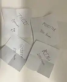 The game begins with making 4 chits namely Raja (2000 points), Mantri (900 points), Chor(0 points) and Sipahi (700 points). Each chit is folded-shuffled and distributed among 4 players with each player picking one chit. Players can open their respective chit to find out their character(which shall not be revealed to anybody). The Sipahi then has to identify the ‘Chor’ from the other 3 players whether they are a “chor” or not. If the Mantri, guesses correctly then the points are retained or else he/she surrenders them to the Chor. If the Sipahi picks the wrong person then the Chor and Sipahi will have to switch points. Several rounds of this game are played before counting the points. The player with the highest score wins the game.[2]
