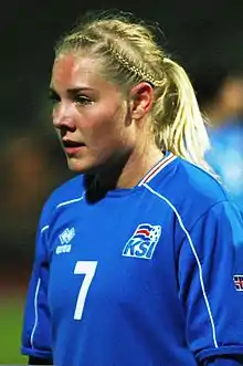 Rakel Hönnudóttir (born 30 December 1988) is an Icelandic footballer and musician who plays as a striker for Besta deild kvenna club Breiðablik and the Iceland national team. She represented her country at the UEFA Women's Championship in 2009 and 2013. Despite being a striker, she has seldom played as one for the national team, even featuring at right back.[1]