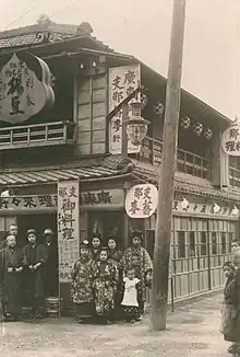 According to ramen expert Hiroshi Osaki, the first specialized ramen shop was Rairaiken (来々軒), which opened in 1910 in Asakusa, Tokyo. The Japanese founder, Kan'ichi Ozaki (尾崎貫一), employed twelve Cantonese cooks from Yokohama's Chinatown and served the ramen arranged for Japanese customers.[21][22] Early versions were wheat noodles in broth topped with char siu.[8] The store also served standard Chinese fare like wontons and shumai, and is sometimes regarded as the origin of Japanese-Chinese fusion dishes like chūkadon and tenshindon.[23][24]