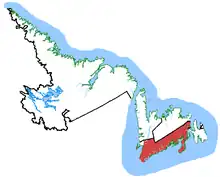"All that area consisting of that part of the Island of Newfoundland lying southerly and westerly of a line described as follows: commencing at Bluff Head on the eastern shoreline of Port au Port Bay; thence easterly in a straight line to Georges Lake; thence easterly in a straight line to the mouth of Lloyds River at the westernmost extremity of Red Indian Lake [now known as Beothuk Lake]; thence southerly in a straight line to a point in Victoria Lake at latitude 48°15'N and approximate longitude 57°21'W; thence generally easterly to the intersection of the Trans-Canada Highway (Route No. 1) with Route No. 230; thence easterly along Route No. 230 to Route No. 230A; thence easterly in a straight line to Ocean Pond; thence southeasterly in a straight line to British Harbour at the entrance of Smith Sound on the north shoreline of Trinity Bay; thence southeasterly to said bay; thence southerly along Trinity Bay to the easterly production in Trinity Bay of the northerly limit of the Town of Sunnyside; thence westerly along said production and said northerly limit to the Trans-Canada Highway (Route No. 1); thence southerly along said highway to the northerly limit of the Town of Come By Chance; thence westerly and southerly along the northerly and westerly limits of said town to the shoreline of Placentia Bay; thence southerly along the Eastern Channel of Placentia Bay and Placentia Bay to a point approximately 20 km west of Cape St. Mary's. Including Random Island, Ireland's Eye, Merasheen Island, Red Island, Long Island, Green Island, Brunette Island, Penguin Islands, Ramea Islands and all other islands adjacent to the shoreline of the above-described area."