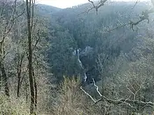 Raven Cliff Falls on Matthews Creek in Caesars Head State Park, Greenville County, South Carolina, is the tallest waterfall in South Carolina. Although the waterfall is described as having a 400 foot drop, topographic maps suggest a height between 320 and 350 feet.