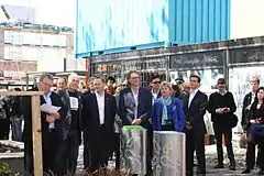 In December 2013, it was announced that by April 2014, Re:START may have to close, which evoked a strong reaction by the public and stakeholders for it to be retained.[16] The lease on the northern part of the mall was about to expire, with most of the land owned by Lichfield Holdings, and a building project was about to start.[5] A month later, it was reported that negotiations were under way for a relocation of the northern part of the mall.[5] In February 2014, the Christchurch newspaper The Press announced that the northern part of the mall was to shift west, to be adjacent to the part that is located south of Cashel Street.[17] The Earthquake Recovery Minister, Gerry Brownlee, announced in March 2014 that the Crown had given a $1.27 million grant to the Restart The Heart Trust for relocation onto land partially owned by the Crown and partially in private hands.[18] It took 10 days to relocate the northern part of the mall,[19] and Brownlee opened the relocated part on 13 June 2014.[15]