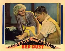 Red Dust is a 1932 American pre-Code romantic drama film directed by Victor Fleming, and starring Clark Gable, Jean Harlow, and Mary Astor.[2] It is based on the 1928 play of the same name by Wilson Collison, and was adapted for the screen by John Mahin.[2][3] Red Dust is the second of six movies Gable and Harlow made together. More than 20 years later, Gable starred in a remake, Mogambo (1953), with Ava Gardner starring in a variation on the role Harlow played and Grace Kelly playing a part similar to one portrayed by Astor in Red Dust.