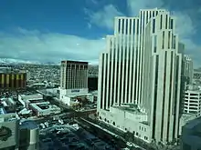 Reno took a leap forward when the state of Nevada legalized open gambling on March 19, 1931, along with the passage of even more liberal divorce laws than places such as Hot Springs, Arkansas, offered. The statewide push for legal Nevada gaming was led by Reno entrepreneur Bill Graham, who owned the Bank Club Casino in Reno, which was on Center Street. No other state offered legalized casino gaming like Nevada had in the 1930s, and casinos such as the Bank Club and Palace were popular. A few states had legal parimutuel horse racing, but no other state had legal casino gambling. The new divorce laws, passed in 1927, allowed people to divorce each other after six weeks of residency, instead of six months. People wishing to divorce stayed in hotels, houses, and/or dude ranches.[16] Many local businesses in Reno started catering to these visitors, such as R. Herz & Bro, a jewelry store that offered ring resetting services to the recently divorced to El Cortez Hotel, which was built specifically to cater to the high number of wedded couples seeking divorces in Nevada.[17][18] Most people left Nevada when their divorces were finalized.[16]