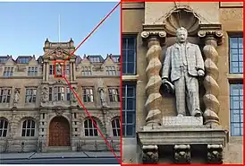 In June 2020, the issue was again brought to attention during the George Floyd protests in the United Kingdom.[93] Two large Rhodes Must Fall protests took place outside Oriel College, on High Street in central Oxford to call for the removal of the Rhodes statue from the Oriel building. The first protest occurred on 9 June 2020 and was attended by over 1000 people.[94] The second protest occurred on the 16th of June and was a march from Cowley, a nearby suburb of Oxford, through to the Oriel College building on High Street and onto the University of Oxford Museum of Natural History.[95] Both protests were peaceful. On 17 June 2020, some University of Oxford professors expressed opinions in support of the Rhodes Must Fall movement at Oxford. In particular, within a letter to The Telegraph, they criticised the University of Oxford Vice-Chancellor Louise Richardson for claims she made concerning the Rhodes Must Fall movement engaging in the 'hiding of history'.[96] In response to this, meetings of Oriel College undergraduates, the Oriel junior common room (JCR), and the Oriel graduates, the Oriel middle common room (MCR), each passed motions calling for the removal of the statue.[97] On 17 June 2020, the Oriel College Governing Body convened to vote on the possible removal of the Rhodes statue. The outcome of this meeting was that the college would formally move to have the Cecil Rhodes statue removed from their building, along with the King Edward Street Plaque.[98] The announcement was not for the immediate removal of the statue, but rather that the College move to immediately establish an 'independent Commission of Inquiry into the key issues surrounding the Rhodes statue', and that the submission from the College Governing Body to this Commission would be for the removal of the Rhodes statue and plaque.[99] The Commission will be led by Carole Souter CBE, the current Master of St Cross College, Oxford and it was announced that the commission will accept written and oral evidence from all stakeholders including activist groups such as Rhodes Must Fall, and the general public. The Commission intends to report by the end of 2020. Councillor Susan Brown, Leader of Oxford City Council, welcomed this announcement and invited an 'early submission of a formal planning application from Oriel to accompany the review process and feed into it'.[100] Should Oriel College submit a planning application for the removal of the statue from what the College refers to as 'The Rhodes Building' listed building consent and the permission from Historic England will be required, as the building is grade II* listed.[101]