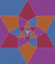 The deltoidal trihexagonal tiling is a dual of the semiregular tiling known as the rhombitrihexagonal tiling. Conway calls it a tetrille.[1] The edges of this tiling can be formed by the intersection overlay of the regular triangular tiling and a hexagonal tiling. Each kite face of this tiling has angles 120°, 90°, 60° and 90°. It is one of only eight tilings of the plane in which every edge lies on a line of symmetry of the tiling.[6]