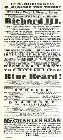What is known for sure is that Cibber's play was first staged at Drury Lane. After the première the play was staged again in February and March 1700 before its performance was discontinued. Cibber's version was not staged again for the next four years. It made its first reappearance on the stage in 1704 and then had to wait for another six years before being taken back into the performance circuit in 1710. There was a large increase of the number of performances of this play from the year 1710. The popularity of the play is also reflected by the presence of the Prince and Princess at the performance on 27 January 1715 in Drury Lane Theatre. The adaptation therefore did not suffer of being a failure for too long: only a few years later the play became a huge success, which it remained for nearly two hundred years up to the nineteenth century. This is also reflected in the editions of the play published in the eighteenth century. After 1731 the play was frequently reprinted and published, reflecting a significant demand. In 1714–1749 it was performed at least 170 times in different theatres.[8] The quantity of performances rose even further after 1749. According to Frances M. Kavenik, who concentrated on collecting information on Restoration Drama, Richard III was staged 241 times in 1747–1779.