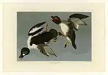 Right and Left is a 1909 oil on canvas painting by the American artist Winslow Homer. It depicts a pair of common goldeneye ducks at the moment they are hit by a hunter's shotgun blast as they attempt to take flight. Completed less than two years before his death, it was Homer's last great painting,[1] and has been the subject of a variety of interpretations regarding its origin, composition and meaning. As with his other late masterworks, it represents a return to the sporting and hunting subjects of Homer's earlier years, and was to be his final engagement with the theme. Its design recalls that of Japanese art, and the composition resembles that of a colored engraving by John James Audubon.
