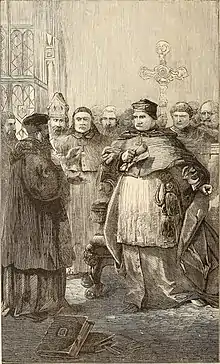 As a result, in 1526 Barnes was brought before the vice-chancellor for preaching a heretical sermon, and was subsequently interrogated by Wolsey and four other bishops. He was ordered to abjure his sermon or be burnt; and, after choosing the former, was committed to the Fleet prison, but afterwards conditionally released to the Austin Friary in London. Although under house arrest in the Friary, Barnes was allowed visitors. It was subsequently discovered that while incarcerated there, Barnes was secretly a distributor of illegal copies of William Tyndale's Protestant Bible.[2]