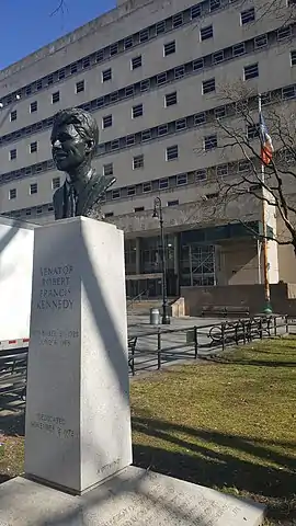 The Robert F. Kennedy Memorial is a memorial depicting Robert F. Kennedy by Anneta Duveen, installed outside the New York State Supreme Court building in Brooklyn's Columbus Park, in the U.S. state of New York. The memorial was cast in 1972, and dedicated on November 2 of that year. It features a bronze bust resting on a Kitledge gray granite pedestal and base; the granite was mined from New Hampshire, and the pedestal is inscribed with four quotes by Kennedy.[1]