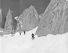 In Yosemite, Brinton and Bill Rice made the second ascent of Royal Arches (class 5.9) and Lower Cathedral Spire in May 1937 (and again in 1941).[25] A climb up the North Palisade in July 1938 led to the rescue of three climbers who were unroped and inadequately equipped; after roping the climbers and assisting them to the top, the group spent an unanticipated and cold night on the mountain.[26]