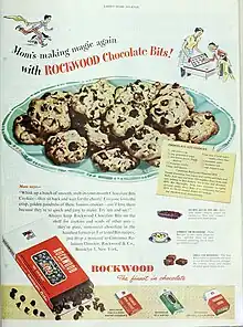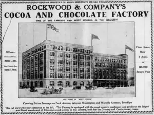 Wallace T. Jones and W. E. Rockwood founded Rockwood & Company in 1886 and originally operated a chocolate factory on Cherry Street in Manhattan until 1904, when it moved to Brooklyn. At the time, it was the second largest producer of chocolate in the country, next to Hershey's.[1] It processed raw cocoa into chocolate and made coatings, bars, cocoa, baking chocolate, and other confections.[2][1] Rockwood may have been the first to introduce chocolate sprinkles (marketed as "Decorettes") to the United States circa 1915,[3] and in later years its bestselling product was chocolate chips (marketed as "Chocolate Bits").