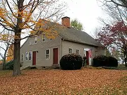 The Roderick Bryan House stands in a rural area of northeastern Watertown, at the northeast corner of Linkfield and Bryan Roads. It is a 1+1⁄2-story Cape style wood-frame structure, oriented facing west toward Linkfield Road. It has a gabled roof, central chimney, and clapboarded exterior. The main facade is five bays wide, with a center entrance framed by a 1940s Federal Revival surround of sidelights, doubled pilasters, and a peaked entablature with cornice. An ell extends to the rear (east) of the main block, joining the house to a barn. The interior follows a typical central chimney plan, with chambers to either side of the chimney, and a long room across most of the rear. Stairs to the attic are found in one corner. The interior retains many original features, including wainscoting, chair rails, fireplace paneling, and doors.[2]