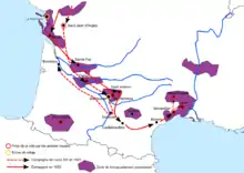 In February 1625, Soubise led a second Huguenot revolt against Louis XIII,[6] and, after publishing a manifesto, invaded and occupied the island of Ré, near La Rochelle.[7] From there he sailed up to Brittany where he led a successful attack on the royal fleet in the Battle of Blavet, although he could not take the fort after a three weeks siege. Soubise then returned to Ré with 15 ships and soon occupied the Ile d'Oléron as well, thus giving him command of the Atlantic coast from Nantes to Bordeaux. Through these deeds, he was recognized as the head of the Huguenots, and named himself "Admiral of the Protestant Church".[8] The French Navy on the contrary was now completely depleted, leaving the central government vulnerable.[9]