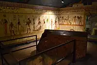 The Rosicrucian Egyptian Museum contains a composite replica of an ancient Egyptian rock-cut tomb, based on photos and sketches taken by Rosicrucian expeditions to tombs at Beni Hasan, in order to give the guests the experience of being in such an excavation. Below are photographs of the interior of the replica tomb, largely containing scenes from the Book of the Dead. The dark interior of the tomb replica is evident.