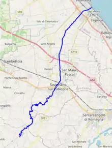 Furthermore, the features of the present-day Rubicon river (north–south course, orthogonal to the Via Aemilia) and the Via Aemilia itself (a straight reach before and after the crossing, and a turn just passing by San Giovanni in Compito, so marking a possible administrative boundary) are common to typical geographical oriented limits of Roman age, being what made this a clue of actual identification of the present-day Rubicon River with the Fiumicino.[6]