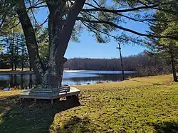 Ruby Cohen was a prominent member of Colchester's society who lived from 1911 to 1999. His significance began when he purchased "Harry's Place" in 1925. To this day, Harry's Place is still a successful roadside burger stand. Harry's Place is on the National Register of Historic Places and is the remnant of seven hotels created by Baron Maurice de Hirsch, financier of the Orient Express. Maurice de Hirsch recognized Colchester's potential as a settlement for Jewish immigrants, which is the reason he opened the hotels. Ruby Cohen retired in 1973. Ruby Cohen's former house is visible from the woodlands and is located across from the gazebo on the opposite side of the pond in the picture below.