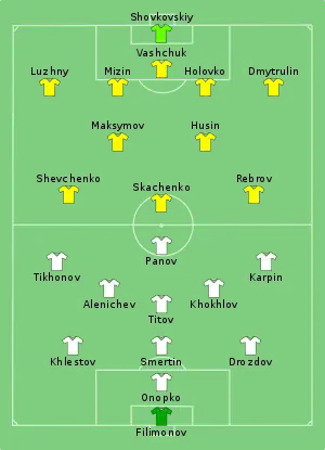 In the 75th minute Valeri Karpin opened the score with a powerful free kick.[3] This appeared to provide Russia the result they needed, and Ukraine was heading out of qualifying. However, in the 87th minute, Andriy Shevchenko took a long free kick sending the ball towards the Russian goal. The shot appeared to be savable, but Russian goalkeeper Aleksandr Filimonov was surprised by the effort and, trying to catch the ball, knocked it into his own net.[3]