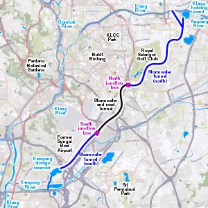 It begins at Kampung Berembang lake near Klang River at Ampang and ends at Taman Desa lake near Kerayong River at Salak South. The project is led by the government, including Malaysian Highway Authority (Lembaga Lebuhraya Malaysia, LLM) and the Department of Irrigation and Drainage Malaysia (Jabatan Pengairan dan Saliran, JPS) and also a company joint venture pact between Gamuda Berhad and MMC Corporation Berhad (MMC).