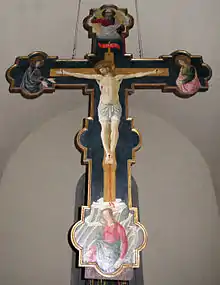 The holy water font (15th) century is sculpted in marble. The baptismal font is modern. A wall altar with a stone arch has 15th-century frescoes of the Baptism by Davide Ghirlandaio and a Madonna and Saints by Domenico Ghirlandaio. The main tabernacle dates from the 15th-century. The main altar was a painted 15th-century crucifix by Giovanni di Francesco. A door on the right opens to the sacristy. On the right wall is a 15th-century triptych, depicting an Annuciation with Saints Eustache and Anthony Abbott by the school of Dal Ponte. The museum displays the 15th-century stone pulpit. An altarpiece depiction God the Father with Angels (1480) and an Enthroned Madonna and Child by Giovanni Botticini. A fresco depicts Saints Sigismond and Albert (1520) attributed to the school of Raffaellino del Garbo. The museum also has a Madonna of the Rosary with Saints attributed to Matteo Rosselli.[1]