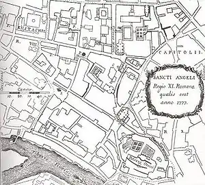 The great number of people living in such a small area,[33] together with the poverty of the population, caused terrible hygienic conditions. The district, lying very low and near the Tiber, was often flooded. 800 of 4,000 inhabitants in the plague of 1656.[34] Sant'Angelo, which was the rione with the smallest area, was also, thanks to the presence of the Ghetto, the one having the largest population density.