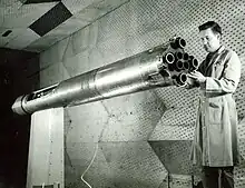 Wernher von Braun's team at the U.S. Army Ballistic Missile Agency (ABMA) started studying the problem in April 1957. They calculated that a rocket with the required performance would require a lower-stage booster with a thrust of about 1.5 million pound-force (6.7 MN) thrust at takeoff. As it happened, the Air Force had recently started work on just such an engine, eventually emerging as the F-1. But the F-1 would not be available in the time frame that the DoD was demanding and would be limited to about 1 million lbf in the short term anyway. Another possibility was a Rocketdyne engine, then known as the E-1, which provided about 360,000 to 380,000 lbf (1,600 to 1,700 kN), four of which would reach the required thrust levels. This approach became the favorite and was paired with a first stage built from a cluster of nine tanks placed atop a thrust plate where the engines and plumbing would be attached. The design envisaged eight rocket tanks similar to the Redstone stage strapped around a central larger tank derived from a Jupiter rocket. The design and diameter similarities would enable the use of the same tooling and facilities used to produce the older tanks, speeding up the design and production phases of the new stage.[5] Contrary to what was reported to the press at the time (and propagated commonly ever since), the tanks were not simply Redstone and Jupiter tanks, but much longer versions built anew at the same diameter.[5]