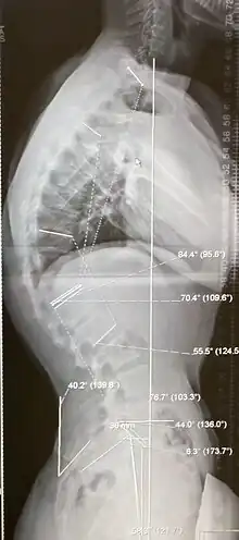 Diagnosis is typically by medical imaging. The degree of kyphosis can be measured by Cobb's angle and sagittal balance.