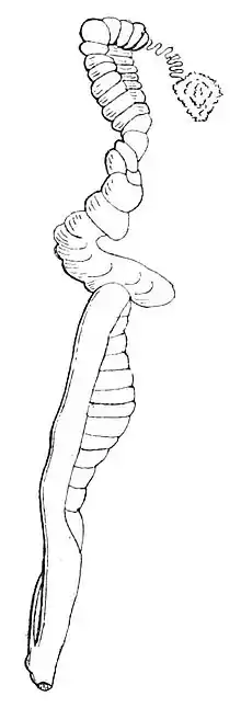 The digestive system contains enormous buccal mass in size and muscular development. The pharynx (the largest part of buccal mass) is so large, occupying almost the whole length of the visceral cavity. The esophagus enters to the buccal cavity dorsally in the anterior fourth. The stomach forms a simple elongated sac.[7]