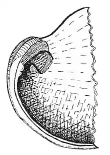 The radula is 12 mm long and 3 mm in width.[10] It has 61 rows of denticles (tiny teeth). There is sometimes a rudimentary tooth in the centre of some rows. The number of lateral teeth varying from 24 to 28. Charles Hedley[10] described radula formula with 26 teeth: 24 + 0 + 24 × 61 while Robert C. Murdoch[11] described radula formula with usual 26 teeth: 26 + 0 + 26 × 61. The innermost four teeth are small and slender, then they increase rapidly in size. The 25th tooth is rather smaller than the 24th, and the 26th is minute and occasionally absent.[7]