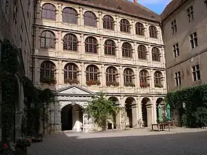 Shortly before he passed away, count Friedrich decided to convert the castle into a renaissance dwelling.[1][4] In the 1550s, he started with demolishing most of the medieval castle, except for parts of the northern wing.[4] His son, count Joachim (1538-1598), was responsible for most of the new work.[1][4] Between 1560 and 1575, he created a four-wing complex with a beautiful renaissance court yard.[1][4] The older parts of the castle were covered by a renaissance façade.[1] These structural changes gave the castle its current Renaissance-style appearance.[1] The work was directed by master builder Hans Schwarz.[1]