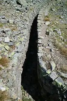 A schneekragen (German for snow collar) or schneehals (snow neck) was a safety corridor characteristic for alpine mining. Covered with lumbers or roundwood, it guaranteed somewhat avalanche-safe access to the adits during winter. Furthermore it protected the miners from cornices and ensured the passage of deep snow areas.[1] Miners' houses, workshops and processing plants were often connected through a system of schneekragens with the adits, so the miners did not have to shovel. The corridors, often built of dry stone, barely reached man-high and had to be crossed cowered down or crawling.[2][3] Because the entries were sometimes covered by cornices some schneekragens kept impassable and dynamite chests like other heavy equipment normally transported with horses had to be dragged through the danger zone.[4]