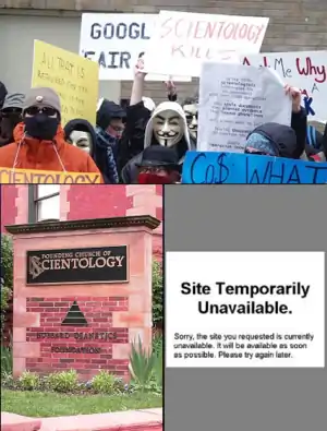 ![]() Counterclockwise from above: Protest by an Internet group calling itself 'Anonymous' against the practices and tax status of the Church of Scientology; Monument-style sign in front of the Founding Church of Scientology in Washington DC; Screenshot of error message when attempting to load www.scientology.org on January 25, 2008. | |||