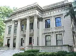 It was built in 1907, and is a three-story, 40,950 square foot, Beaux Arts style mansion. The house is seven bays wide and is faced with a pale Indiana limestone. It features a central portico of four, giant Corinthian order columns and two Corinthian pilasters that dominate the highly formal, symmetrical entrance façade. On the interior, the first floor of the Scott House can be understood as an architectural museum, with rooms in many different styles. Also on the property is a Tudor-style, half-timbered carriage house (1902).[4]