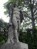 Appearing at the base of the grotto are four tritons—creatures who are half-man and half-fish—who are part of the sea-god's entourage. Each holds a conch shell trumpet with which they can inspire fear. They are restraining the sea-horses who draw Neptune's chariot across the seas.[40] This image of Neptune commanding the watery dominion was a common symbol in sixteenth, seventeenth, and eighteenth-century art, to represent monarchs controlling the fate of their people.[40] In the nineteenth century, a bank of evergreen trees was planted behind the white figural group to provide a dark contrast.[40]