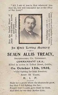 Seán Allis Treacy (Irish: Seán Ó Treasaigh; 14 February 1895 – 14 October 1920) was one of the leaders of the Third Tipperary Brigade of the IRA during the Irish War of Independence.[1] He was one of a small group whose actions initiated that conflict in 1919. He was killed in October 1920, on Talbot Street in Dublin, in a shootout with British troops during an aborted British Secret Service surveillance operation.