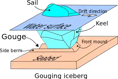 Seabed gouging by ice is a process that occurs when floating ice features (typically icebergs and sea ice ridges) drift into shallower areas and their keel comes into contact with the seabed.[1][2][3] As they keep drifting, they produce long, narrow furrows most often called gouges, or scours.[4][5][6] This phenomenon is common in offshore environments where ice is known to exist. Although it also occurs in rivers and lakes,[7][8] it appears to be better documented from oceans and sea expanses.[2][4][5]