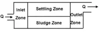 In the inlet zone, flow is established in a same forward direction. Sedimentation occurs in the settling zone as the water flow towards to outlet zone. The clarified liquid is then flow out from outlet zone. Sludge zone: settled will be collected here and usually we assume that it is removed from water flow once the particles arrives the sludge zone.[9]
