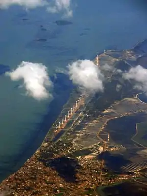The Seguwantivu Wind Farm utilizes thirteen 800-kilowatt Gamesa AE-59 wind turbines, while the Vidatamunai Wind Farm utilizes twelve wind turbines also of the same model, thus totalling the installed capacity to 9.6MW and 10.4MW respectively. The wind farm is approximately 3.2 km (2.0 mi) in length, and is diagonal from north-west to south-east, with the mainland on the north-east the Puttalam Lagoon on the south-west.[2] The twelve northern turbines belong to Vidatamunai Wind Farm, while the thirteen southern turbines belong to Seguwantivu.[3] The wind farms cost US$40 million to construct.[4]