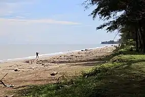 A popular recreation area just five-minutes drive from Tutong town, the beach's appeal is the effect created by a narrow spit of land that separates the mirror-smooth Tutong River from the ruffled waters of South China Sea.[5] Chalets, restaurant, huts, a playground and food stall are available.[6]