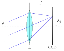 A Shack–Hartmann (or Hartmann–Shack) wavefront sensor (SHWFS) is an optical instrument used for characterizing an imaging system.[1][2] It is a wavefront sensor commonly used in adaptive optics systems. It consists of an array of lenses (called lenslets) of the same focal length. Each is focused onto a photon sensor (typically a CCD array or CMOS array[3] or quad-cell[4]). If the sensor is placed at the geometric focal plane of the lenslet,[5] and is uniformly illuminated,[6] then, the integrated gradient of the wavefront across the lenslet is proportional to the displacement of the centroid. Consequently, any phase aberration can be approximated by a set of discrete tilts. By sampling the wavefront with an array of lenslets, all of these local tilts can be measured and the whole wavefront reconstructed. Since only tilts are measured the Shack–Hartmann cannot detect discontinuous steps in the wavefront.