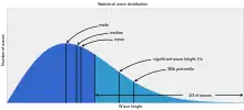 Generally, the statistical distribution of the individual wave heights is well approximated by a Rayleigh distribution.[7] For example, given that Hs is 10 metres (33 feet), statistically: