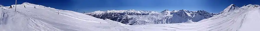 The height of the area extends from 700 m to 2,430 m. The ski area offers 141 km of certified pistes over 50% of which are at over 2,000 meters.[4] These 141 km consist of 27 easy pistes (60 km), 24 pistes of medium difficulty (45 km), 8 difficult pistes (8 km) and 28 km free ride routes.[5][6] Skiers can improve their racing skills on two speed measurement tracks. Additionally, there are 8 km of winter hiking trails.
