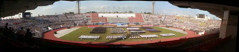 The opening ceremonies are a grandiose affair, alternating between a full stadium-sized ceremony with marching contingents by the uniformed groups and mass display segments, and indoor ceremonies showcasing the performance arts groups. The former are currently held during the even years, and the latter, the odd years, although the rebuilding of the National Stadium has required a temporary shift into the Singapore Indoor Stadium even for the traditionally outdoor ceremonies.