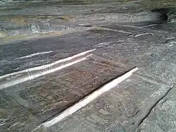 Ezhadippattam or Jaina beds is a natural cave, marked by a horizontal floor space which is laid out with well-polished rock beds that were used by Jaina ascetics. There are seventeen beds at the top marked on the floor. These carved beds have headrests cut in them in the form of a raised pillow. The oldest Tamil Brahmi inscriptions seen inscribed on the beds are dated to the 3rd century BC, although recent research by Iravatham Mahadevan dates it to the First Century BC and extending to the 10th Century AD. On one of the oldest and largest beds, the inscription in Tamil is of Tamil Brahmi script of the 1st century BC, considered as the oldest lithic record of South India.[4] Also, names of ascetics who engaged in sallekhana (fasting unto death) are written on their respective beds.[4]