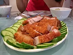 Siu yuk (Chinese: 燒肉; pinyin: shāo ròu; Cantonese Yale: sīu yuhk; lit. 'roast meat') is a variety of siu mei, or roasted meat dishes, in Cantonese cuisine. It is made by roasting an entire pig with seasonings, such as salt and vinegar[1] in a charcoal furnace at high temperature. [2] Roasted pigs of high quality have crisp skin and juicy and tender meat. Usually the meat is served plain with its skin, but it is sometimes served with soy sauce or hoisin sauce.