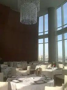Sixteen had been described architecturally as a sequence of spaces that do not reveal themselves at once, but rather in "procession".[6] The restaurant's foyer is T-shaped, and a passageway to the hotel is lined with floor-to-ceiling architectural bronze wine racks in opposing red and white wine rooms.[4][7][8] The passageway leads to views—praised by Chicago Tribune Pulitzer Prize-winning architecture critic Blair Kamin—that showcase the Wrigley Building clock tower and the Tribune Tower's flying buttresses. Kamin regarded these views to be "more intimate" than the panoramic ones of the Signature Room, a restaurant near the top of the 100-story John Hancock Center.[4] The views were described to be equally impressive by day and by night.[8] The main part of the procession was the Tower Room, a dining room with a 30-foot (9.1 m) dome-shaped ceiling made of West African wood. The dome was furnished with Swarovski chandeliers[9][10] and incorporated mirrors so that all diners can experience the view.[6] The restaurant had two other dining rooms, named for their views: the Bridge Room and the River Room.[11]