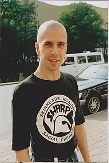 In the late 1970s, the skinhead subculture was revived to a notable extent after the introduction of punk rock.[23] Most of these revivalist skinheads reacted to the commercialism of punk by adopting a look that was in line with the original 1969 skinhead style. This revival included Gary Hodges and Hoxton Tom McCourt (both later of the band the 4-Skins) and Suggs, later of the band Madness. Around this time, some skinheads became affiliated with far right groups such as the National Front and the British Movement.[24] From 1979 onwards, punk-influenced skinheads with shorter hair, higher boots and less emphasis on traditional styles grew in numbers and grabbed media attention, mostly due to football hooliganism. There still remained, however, skinheads who preferred the original mod-inspired styles.[25]